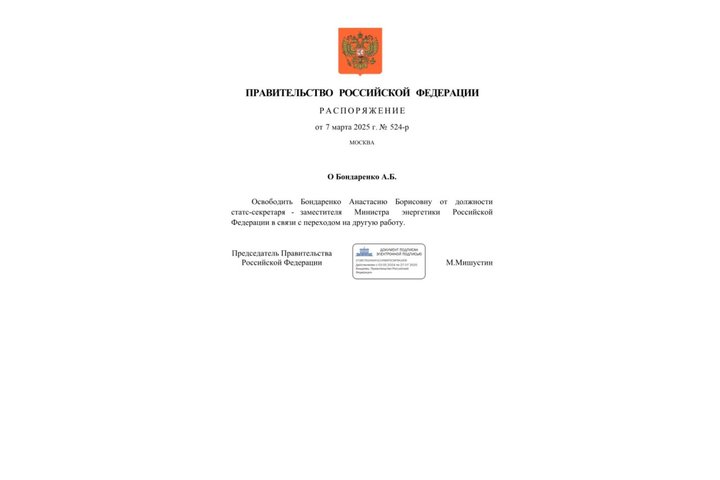 - Председатель правительства России Михаил Мишустин освободил Анастасию Бондаренко от должности статс-секретаря и заместителя министра энергетики в связи с переходом на другую работу. Бондаренко работала в Минэнерго с 2003 года и занимала пост замминистра с февраля 2018 года, отвечая за законопроектную деятельность, антикоррупционные мероприятия и развитие кадрового потенциала в энергетическом секторе.