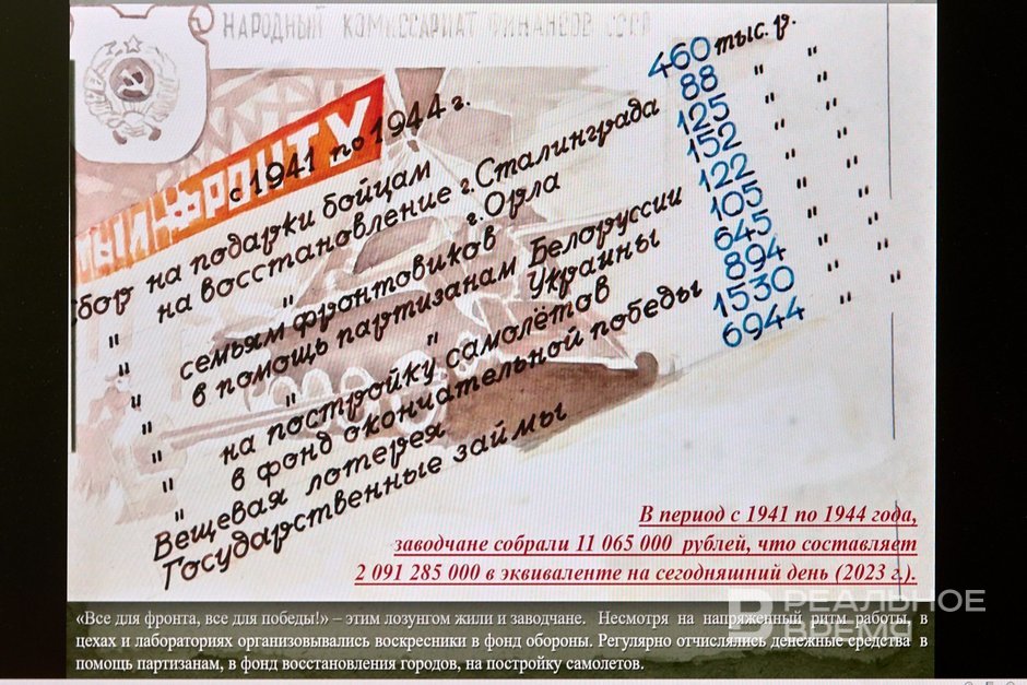 — За годы войны заводчане собрали в переводе на наши деньги более 2 млрд рублей, перечисляли их в помощь партизанам, семьям погибших, на восстановление городов, постройку самолетов, сбор теплых вещей для Армии, поддержку госпиталя — у нас был свой подшефный госпиталь. В годы войны мы даже телеграмму от Сталина получили, где он благодарит заводчан за то, что в 1943 году перечислили 842 тысячи рублей, сейчас это 159 млн, — указал Валерий Соломахин.