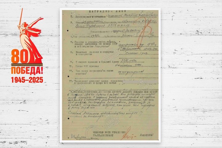 «Автоматчик разведроты управления 53-й гвардейской танковой бригады 4 марта 1944 г., будучи в дозоре, вел разведку по маршруту бригады. В группе разведчиков одним из первых ворвался в село Сосновка, занятое противником. Захватил двух пленных, документы и исправный вездеход, который был передан в роту управления».