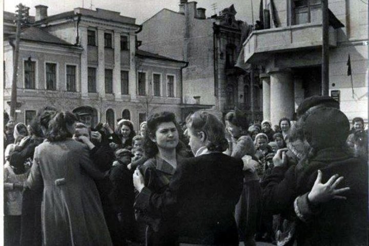 Стихийные митинги возникали то тут, то там. На площадях и главных улицах раздавались звуки оркестров, слышались баяны, люди танцевали прямо на улицах. Особенно многолюдно было на улице Баумана, где с балконов Дома печати разлетались листовки с последними сводками. Кинотеатры распахнули свои двери, в фойе играла музыка, а в буфетах угощали зрителей. В этот день в магазинах Казани продуктовые карточки обменивали на пряники и карамельки.