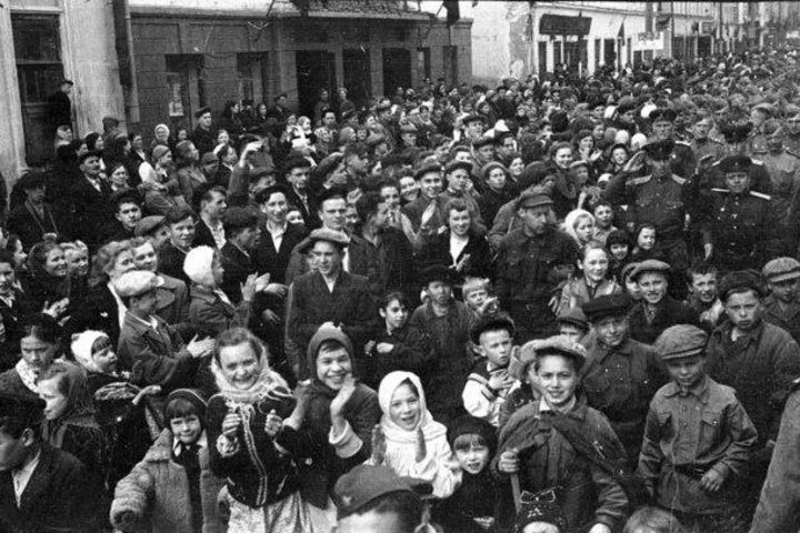 Среди толпы были фронтовики, вернувшиеся с ранениями, и солдаты только что из госпиталей. Их поднимали на руки, угощали спиртным, а военные стреляли в воздух в знак торжества.