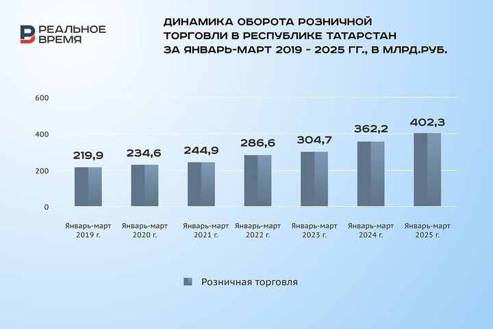 Оборот розничной торговли в Татарстане за первые три месяца 2025 года вырос на 1,7% — до 402,3 млрд рублей. Причем продовольственная и непродовольственная розница продемонстрировали синхронность — рост в обоих сегментах составил 1,7%. Оборот розничной торговли пищевыми продуктами увеличился с 161,4 млрд в первом квартале 2024 года до 186,6 млрд рублей, оборот непродовольственной розницы — с 200,8 млрд рублей до 215,7 млрд рублей.
