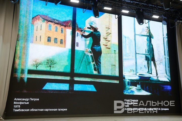 Мотив зеркала, по его словам, становится важнее мотива окна. «Зеркала отражают интерьеры, и этот интерьер проецируется на окно. И таким образом возникает этот странный магический портал», — сказал искусствовед. На одной чаше весов — Юрий Пименов с его «Весенним окном», где видно: за окном реальность. На другой — Александр Петров и его картина «Мосфильм». Вроде тоже окно, но за ним — декорации. Фальшь. Иллюзия. Художник в этой картине — не созерцатель, а строитель иллюзий. «У Пименова мы верим, что за окном реальность. А у Петрова вместо реальности — симулякр. Он свое чувство реальности ставит под сомнение. Оно у него расшатано», — отметил Светляков.