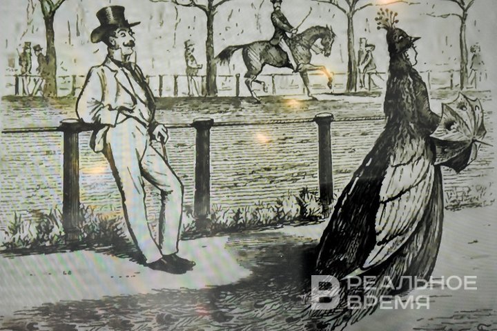 Сходная логика действовала в восприятии турнюра. Этот элемент костюма, особенно модный в 1860–1870-е годы, в сочетании с особым корсетом наклонял женский торс вперед. Возникала особая поза, специфический угол между грудью, талией и бедрами. Гусарова пояснила: «Мы видим это на очень многих изображениях. Где-то эти женщины превращаются в кентавров или фантастических животных. Где-то они превращаются в насекомых». Особенно часто — в ос.