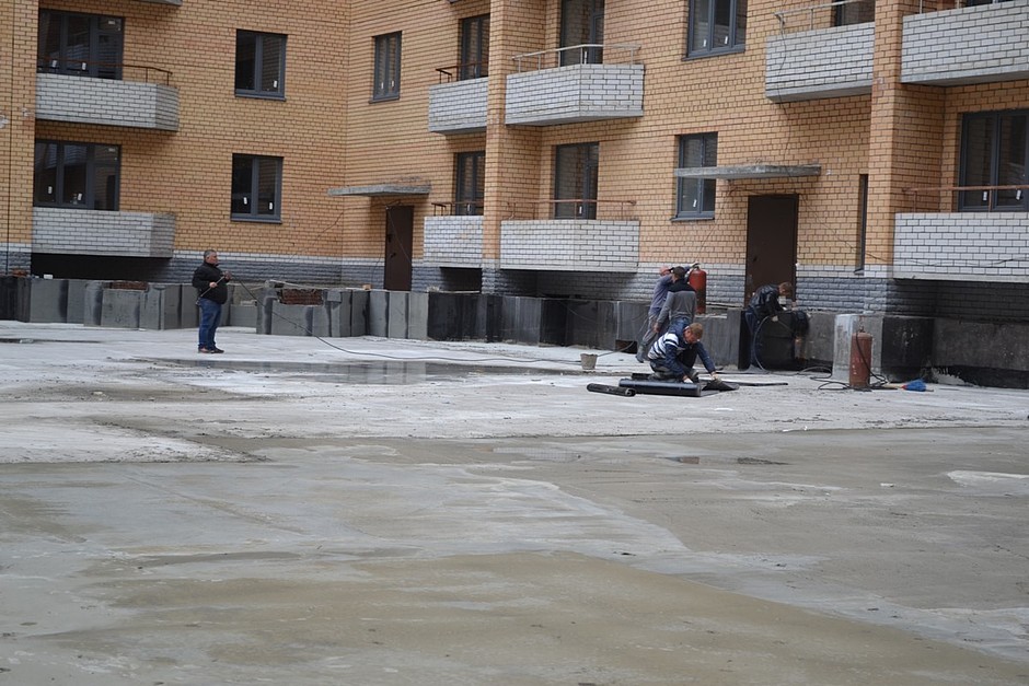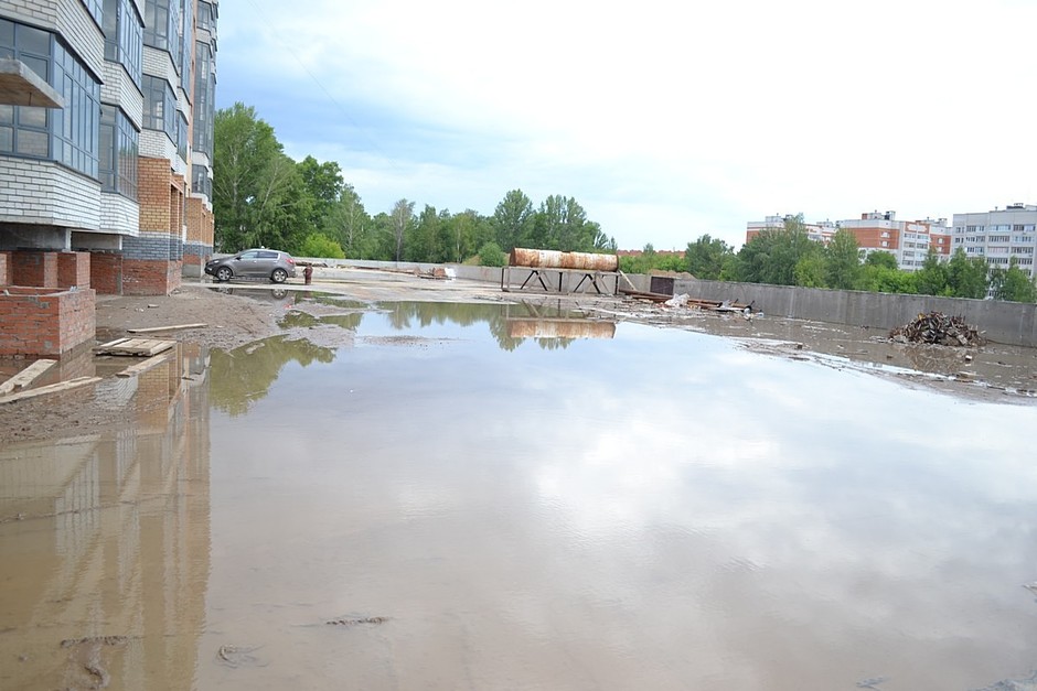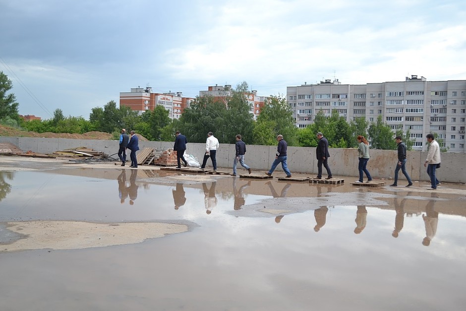 Во время осмотра первого дома вновь обсуждались сети. Забегая вперед, скажем, что в этом вопросе дольщиков ждали хорошие новости. Конечно, многим не терпелось увидеть, что происходит во внутреннем дворе. Напомним, что во время последнего объезда дольщики пожаловались Нигматзянову на подрядчика: они были крайне недовольны тем, что за неделю «Бриз» успел выполнить очень мало работ во внутренней части двора. Как рассказали дольщики еще до начала обхода, после небольшой критики Азата Робертовича работа пошла активнее и в середине недели здесь трудилось немало рабочих. Действительно, большая часть двора уже имеет покрытие. Теперь застройщик, подрядчик и чиновники обсуждали, как сделать так, чтобы при отведении оставшейся воды она не стекала вниз.