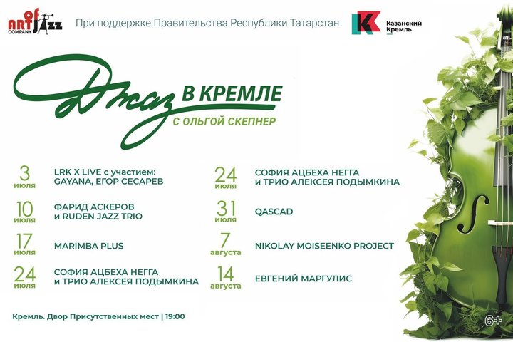 XIX Всероссийский фестиваль импровизационной музыки «Джаз в кремле с Ольгой Скепнер» стартует 3 июля и закончится в середине августа. С самого своего основания фестиваль «Джаз в кремле с Ольгой Скепнер» неизменно стоит на позиции просветительства и популяризации творчества отечественных музыкантов-импровизаторов, и XIX-й сезон — не исключение. В этом году программа фестивального форума представит семь больших концертов мастеров импровизационной культуры России в кремле: Евгений Маргулис, Gayana, LRK Trio с Евгением Лебедевым, Фарид Аскеров, Егор Сесарев, Marimba Plus, Ruden Jazz Band, София Ацбеха Негга, Трио Алексея Подымкина, Эрик Холматов и группа QASCAD, Nikolay Moiseenko Project и др.