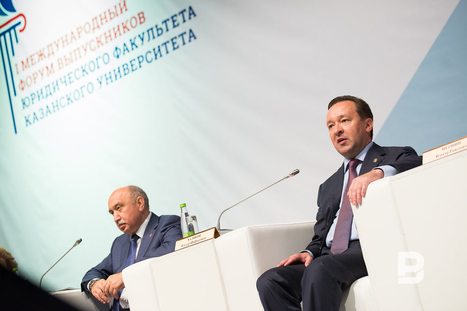 Перед началом торжественного открытия форума известные юрфаковцы — мэр Казани Ильсур Метшин и руководитель Аппарата президента РТ Асгат Сафаров — поделились своими воспоминаниями о студенческих годах в Казанском университете. К примеру, Сафаров рассказал, как он и его одногруппники между собой именовали юридический факультет.