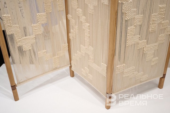 При этом начинается выставка с казанского объекта — это ширма «Яшерен» («Cкрытая») Раушании Полосиной, одного из владельцев музея чак-чака, созданного в рамках интерьерного бренда Tatar Home.