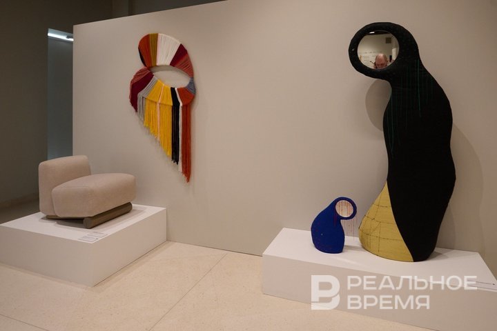 После второго зала уровень «современного» достигал отметки в сотню. На выставке представлены работы мастеров из таких разных городов, как Санкт-Петербург, Екатеринбург, Махачкала, Череповец, Вологда. Можно отметить, что, в первую очередь, дизайнеры вдохновляются авангардом начала XX века с его игрой с формой, содержанием, иронией: кресло, вдохновленное супрематизмом, табурет в шелках, хлопке и жаккарде, вытянутые, словно во снах Дали, чашки. Или, к примеру, зеркала, перекликающиеся в целом с образом Богородицы (а для казанца — еще и с работами Евгения Голубцова).