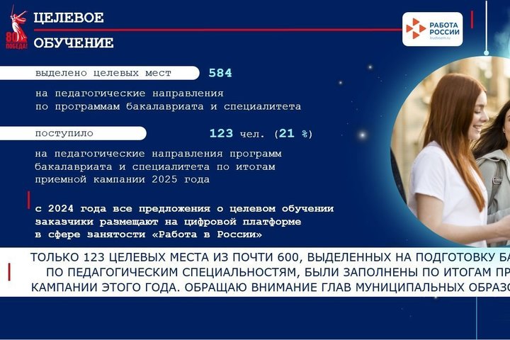 — В этих условиях мы по-прежнему не полностью используем возможности целевого обучения под заказ конкретных муниципалитетов и образовательных организаций, — отметил Ильсур Хадиуллин. — Только 123 целевых места из почти шестисот, выделенных на подготовку бакалавров по педагогическим специальностям, были заполнены по итогам приемной кампании этого года. Обращаю внимание глав муниципальных образований на этот резерв.
