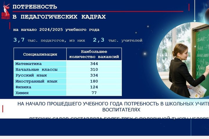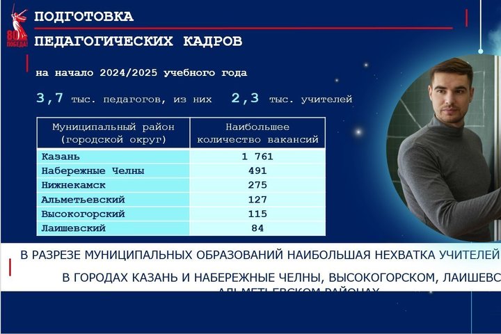 Болезненный кадровый вопрос министр образования и науки РТ оставил напоследок. Он сообщил, что сейчас в системе работает более 76 тысяч педагогов, в том числе более 32 тысяч школьных учителей. При этом на начало 2024/2025 учебного года потребность в педагогах составляла более 3,7 тысячи человек, а наибольшая нехватка учителей отмечена в Казани, Набережных Челнах, Высокогорском, Лаишевском и Альметьевском районах.