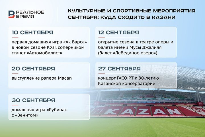 Сентябрь — время, когда аудитория постепенно перемещается на закрытые площадки. Свои первые игры проведут хоккейный «Ак Барс» и баскетбольный УНИКС. Сезон откроет и Театр оперы и балета Мусы Джалиля. Из звезд в Казань приедет небезызвестный рэпер Macan. Более подробная программа — в материале «Реального времени» и «Яндекс Афиши».