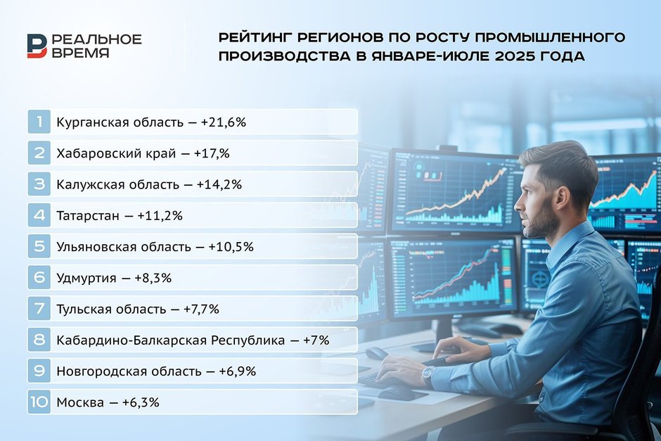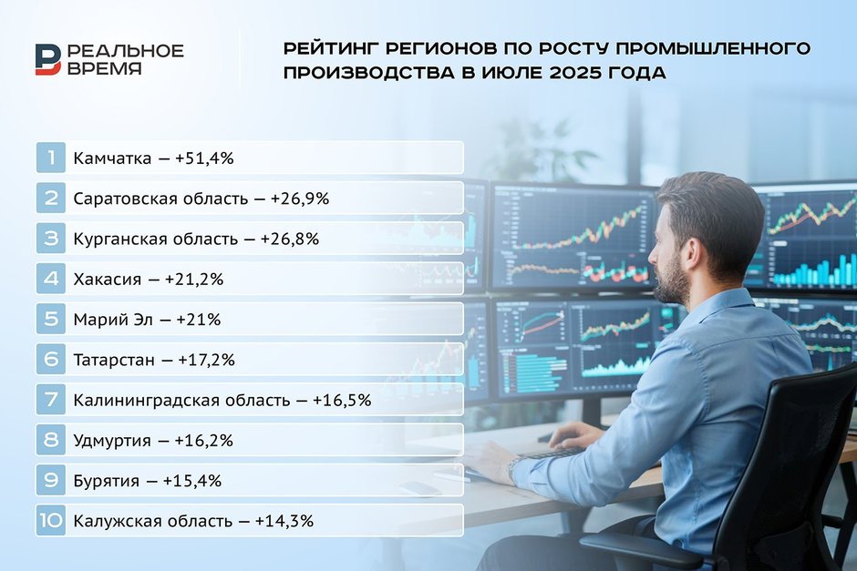 В общем рейтинге регионов по росту промышленного производства за июль Татарстан стал шестым, подсчитало «Реальное время» на основе данных Росстата. По количеству представителей лидирует Приволжский федеральный округ — четыре. По среднему показателю ПФО делит первое место с Центральным федеральным округом — +4,4%.