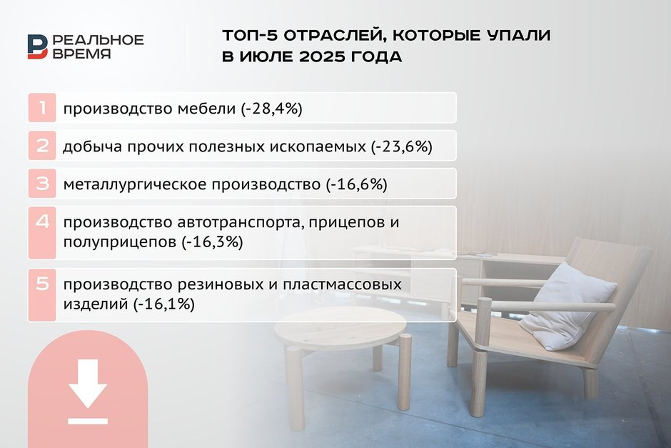 В минус за июль ушла добыча полезных ископаемых (-0,9%). Энергетический сектор и отрасли, связанные с водоснабжением и водоотведением, утилизацией отходов и ликвидацией загрязнений, снизили объемы (-13,3% и -8,8% соответственно). Среди отраслей заметнее всего рухнуло производство мебели — на 28,4%.