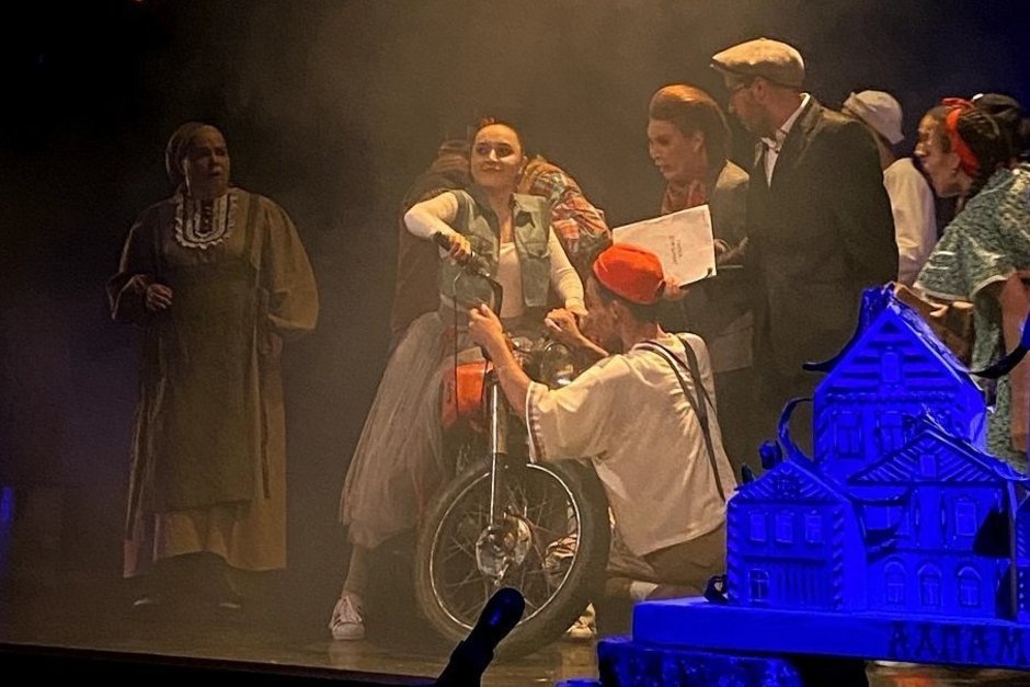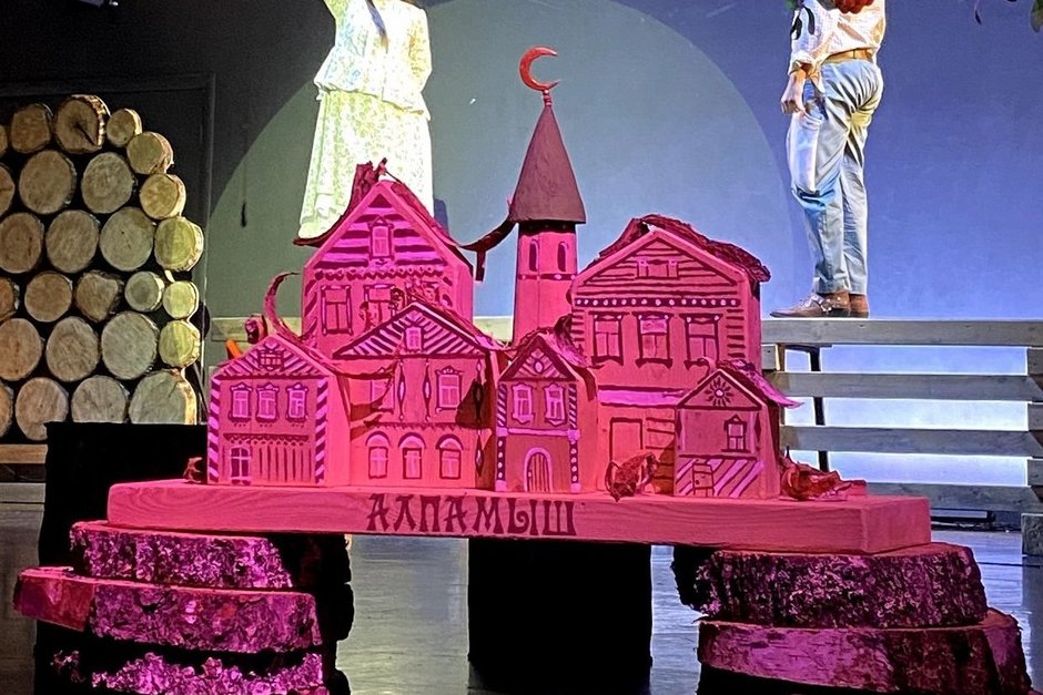 В речи старших мелькает слово «колхоз», которое, по-моему, теперь тоже нужно объяснять. В какой-то момент пьеса превращается в спор начальства и жителя, поскольку Иртуган не хочет пускать уехавших жителей обратно. Аюпов подчеркивает это, выдавая Низамиеву и центровому Айтугану (органичный в ипостаси чиновника Ильназ Хабибуллин) по микрофону. А для утяжеления добавляет каменную Наилю (Амина Галиева). Пьеса превращается в социальную драму. При этом история, что называется, на время открывается — и эта «форточка» остается хлопать до конца.