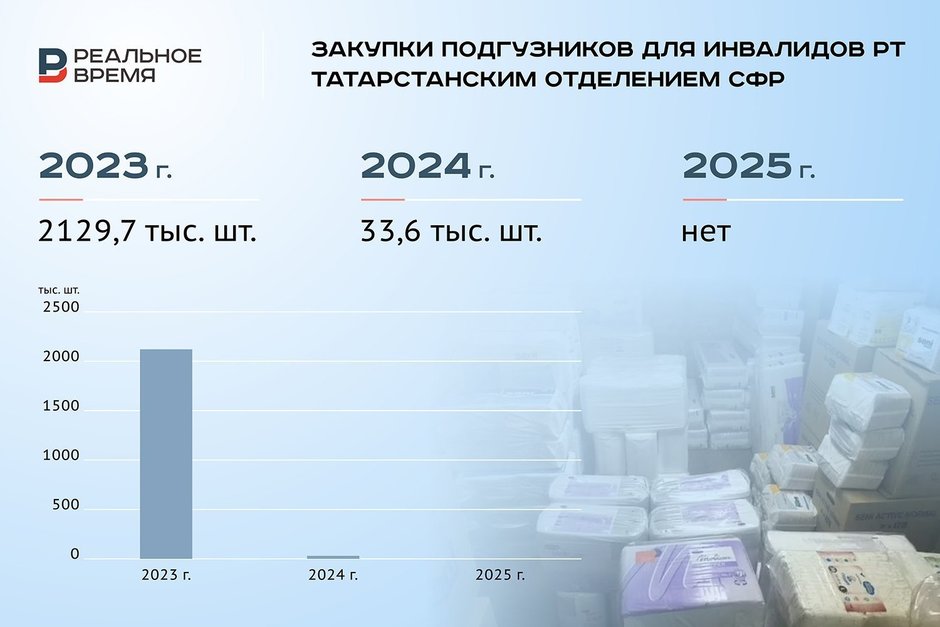 В 2025 году «Реальному времени» не удалось обнаружить на портале госзакупок ни одного тендера Отделения СФР по РТ на закупку подгузников для инвалидов. В 2024 году на «Госзакупках» обнаружился лишь один контракт на закупку подгузников в количестве 33,6 тыс. штук стоимостью 1,1 млн рублей и один контракт на закупку абсорбирующего белья стоимостью 11,6 млн для инвалидов Татарстана. При этом в 2023-м только подгузников, согласно данным портала, было закуплено почти 2,1 млн штук в общей сложности почти на 66 млн рублей.