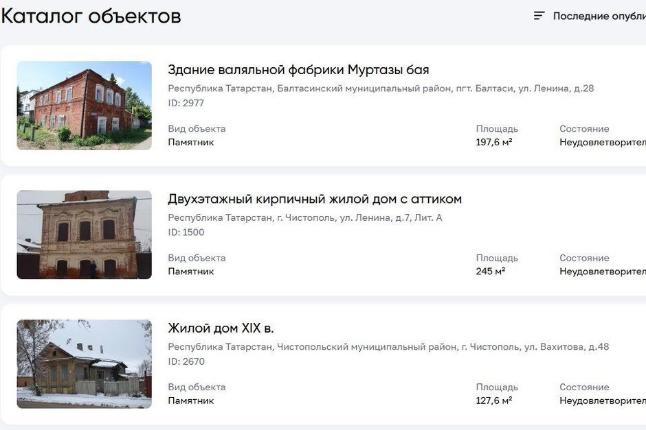 С 2024 года сведения о продаваемых объектах также размещены на платформе «Наследие.Дом.РФ». В список включены 30 памятников Татарстана — большинство находится в Чистополе, Елабуге и Балтасях.