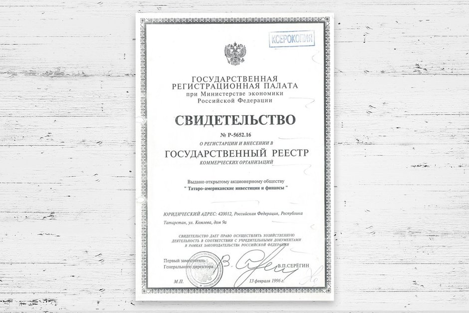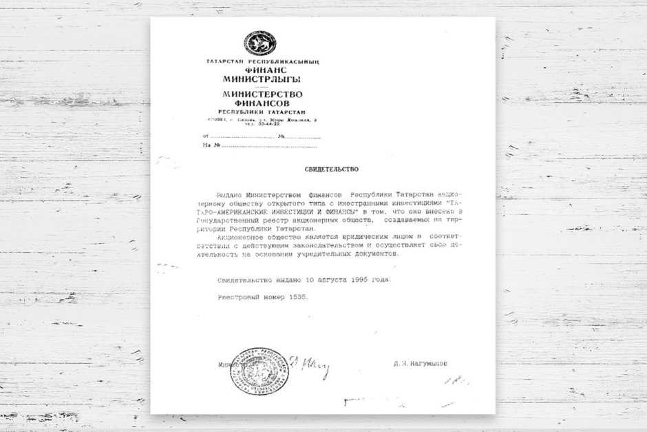 10 августа 1995 года ТАИФ был внесен в Госреестр акционерных обществ, создаваемых на территории Республики Татарстан. В феврале 1996 года компанией было получено свидетельство о регистрации и включении в Госреестр коммерческих организаций Минэкономики РФ.