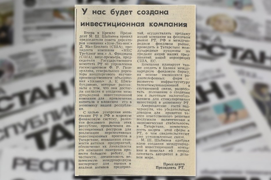 «11 апреля в Кремле президент М.Ш. Шаймиев принял председателя совета директоров компании «Ком-Лиз инк.» Д. Мак-Кенлиса (США), президента компании «НКС Трейдинг инк.» А.З. Фридмана (США), вице-премьера, председателя Государственного комитета РТ по управлению госимуществом Ф.Р. Газизуллина, генерального директора Внешнеторгового научно-производственного объединения «Казань» А.К. Шигабутдинова, которые рассказали о том, что они достигли согласия о создании международной инвестиционной компании для привлечения капитала и вложения его в экономику нашей республики. С целью ускорения интеграции РТ и Российской Федерации в мировую финансовую систему, развития фондового рынка, привлечения инвестиционных ресурсов для реализации перспективных инвестиционных проектов в Татарстане, повышения стоимости активов предприятий, обеспечения их ликвидности эта компания намерена провести большую работу. В частности, организовать независимую международную экспертизу для оценки и анализа активов предприятий, осуществлять продажу акций компании на фондовом рынке, проводить в Татарстане международные аукционы по продаже акций наших предприятий, акций корпораций США, ЕС. Компания планирует также создать в Казани международную фондовую биржу на основе имеющихся радиотелефонных фирм — развитую инфраструктуру телекоммуникационной и спутниковой связи, разработать положение о создании зон с льготным налогообложением для стимулирования инвестиций в экономику РТ. Американские гости подчеркнули, что убедительным доводом для принятия такого ответственного решения послужили политическая и экономическая стабильность в Татарстане, компетентность кадров этой сферы в РТ, о чем свидетельствуют уже установленные связи. М.Ш. Шаймиев одобрил идею создания международной инвестиционной компании и пожелал ей скорее завоевать авторитет в деловом мире», — такое сообщение появилось 12 апреля 1995 года на страницах газеты «Республика Татарстан».