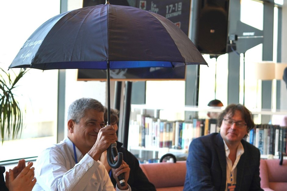 А завершил этот монолог Готье рассказом, что пришел во время сбора всех гостей для общей фотографии в ужас. Им раздали зонтики, которые они раскрыли в фойе Нацбиблиотеки.