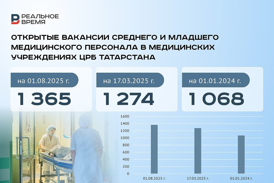 В открытом доступе «Реальное время» нашло публиковавшиеся ранее татарстанским Минздравом данные о вакансиях в медучреждениях республики на 1 августа, 17 марта 2025 года и 1 января 2024 года.