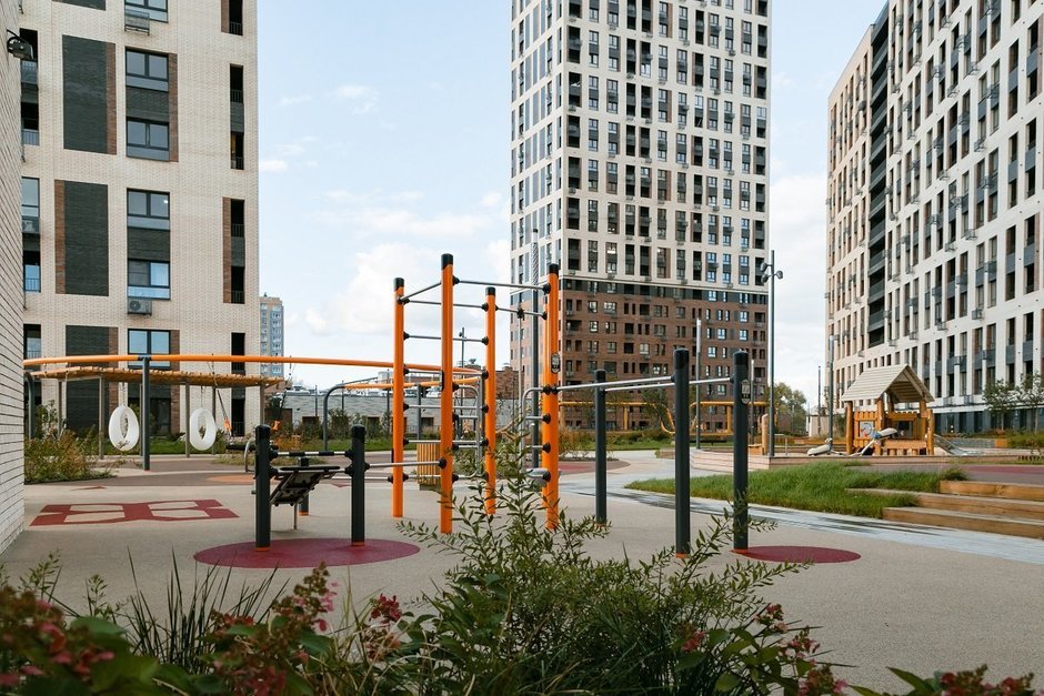 Эльвира: Да, даже сейчас, когда снимались для интервью, ребят от детской площадки было не оторвать. Мне нравится, что двор не ограничивается одной только детской зоной — у него большой потенциал на будущее. Когда дети подрастут, им точно будет чем заняться. Например, на спортивном поле можно будет устраивать соседские турниры по футболу — там даже есть трибуны для зрителей! Ну и нам с мужем скучать не придется — мы любим спорт, так что обязательно будем пользоваться тренажерами во дворе.