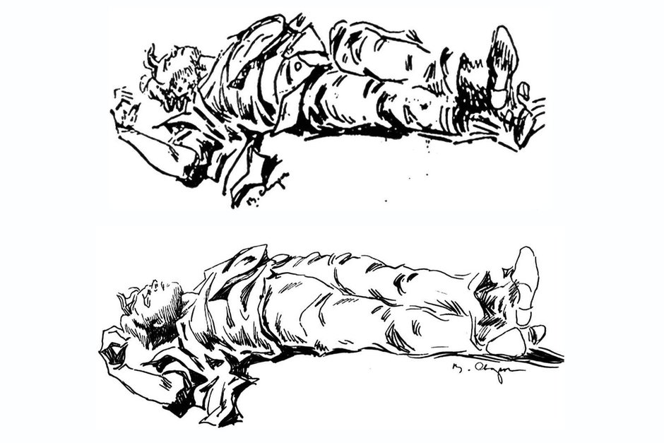 С этой же травмой связана другая — рана в области внутреннего угла правого глаза в виде вытянутого стерженька. Она вообще никак не отражена в актах. Ее и на фотографии сложно увидеть, но видно на первой посмертной маске (их было несколько) под определенным углом. Крусанов разобрал несколько версий появления этой раны, а потом провел «следственный эксперимент». По его версии, это может быть след от курка нагана, а вмятина (или проломленный череп) на лбу — от рукоятки нагана.