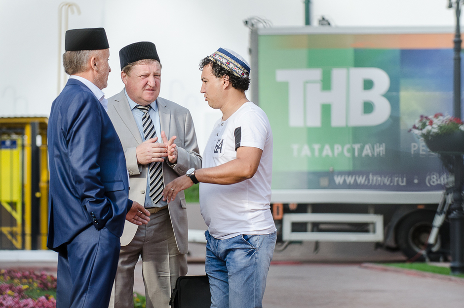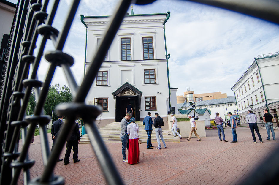 Обновленная Галеевская мечеть встречала гостей белоснежными стенами и сверкающим в золотых лучах минаретом. Хотя заблаговременно было известно, что именно здесь будут читать намаз первые лица республики и пройдет главное празднество, никакой сумятицы не было — прибывающие один за другим проходили в мечеть через охранный пункт у центральных ворот. Праздничные проповедь и молитвы можно было услышать и во дворе, но здесь практически никого не было: мечеть смогла вместить всех пришедших. В отличие от парадного Кул Шарифа в Галеевской мечети была создана праздничная, но вместе с тем домашняя и уединенная атмосфера.