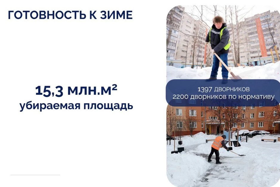 По данным исполкома, крупные управляющие компании (УК), обслуживающие 4 200 многоквартирных домов, располагают штатом из 1 397 дворников. На них возложена задача по уборке придомовых территорий общей площадью 15,3 млн кв. м. При этом нормативная потребность в работниках для выполнения этих задач оценивается почти в 2 200 человек.