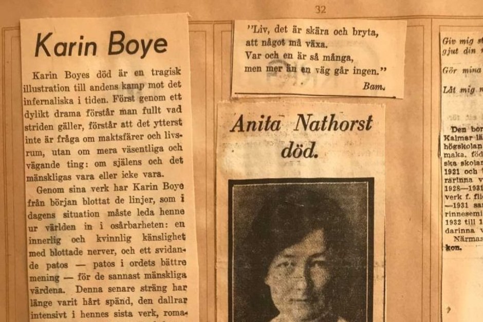 Но за этим внешним триумфом скрывалось разрушение. Бойе узнала, что ее самый близкий человек и подруга Анита Натхорст умирает. «И вот, — писала она в письме к другу, — когда, наконец, достигаешь чего-то, что зрело в тебе двадцать лет, человек, которого это касается, умирает от рака». К тому времени Анита жила в Алингсосе вместе с Бойе, но вскоре переехала в Мальмё — официально «по медицинским причинам». Для Карин это стало ударом. В доме осталась ее подруга и компаньонка Марго Ханель, к которой Бойе испытывала жалость и чувство ответственности за ее судьбу. Внутренние конфликты раздирали Карин на части.