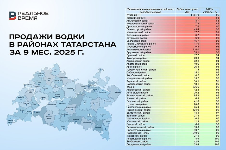Объем реализованной алкогольной продукции без учета пива в Татарстане снизился на 9%, до 10,1 литра на душу населения. Меньше всего крепкие напитки покупали в Дрожжановском (5,2 л), Аксубаевском (5,9 л) и Спасском (6,4 л), а больше всего в Верхнеуслонском (17,3 л), Лаишевском (13,2 л) и Высокогорском (12,2 л) районах. Даже по столице и автограду эти показатели ниже: Казань — 11,1 литра проданного алкоголя на душу населения, Набережные Челны — 10,6 литра.