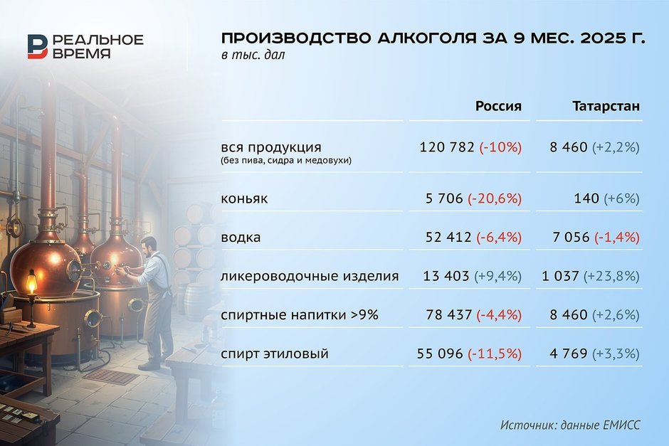 На фоне существенного падения выпуска алкогольной продукции в России по итогам девяти месяцев года Татарстан, напротив, продемонстрировал рост производства. В республике выпустили 8,5 млн декалитров алкоголя (+2,2%), на четверть нарастив выпуск ликеро-водочных изделий — 1,04 млн, и в целом спиртных напитков свыше 9 градусов — 8,5 млн (+2,6%). Но по продажам регион оказался в общем тренде по стране, допустив снижение до 4,05 млн дал (-9%). Эксперты связывают спад с избыточным прошлогодним производством и новым ростом цен, подробнее — в материале «Реального времени».