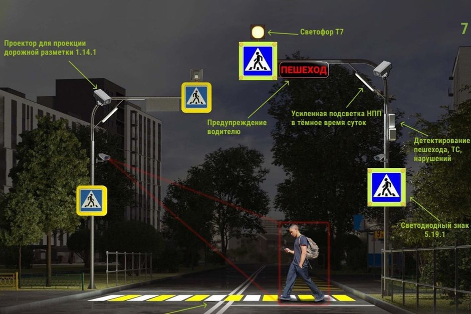 В комплекс входят: локальный сервер, оснащенный системой встроенного искусственного интеллекта, прожекторы освещения зоны пешеходного перехода, табло «Пешеход», которое загорается красным при наличии человека на «зебре», светодиодный дорожный знак и система видеодетекторов.