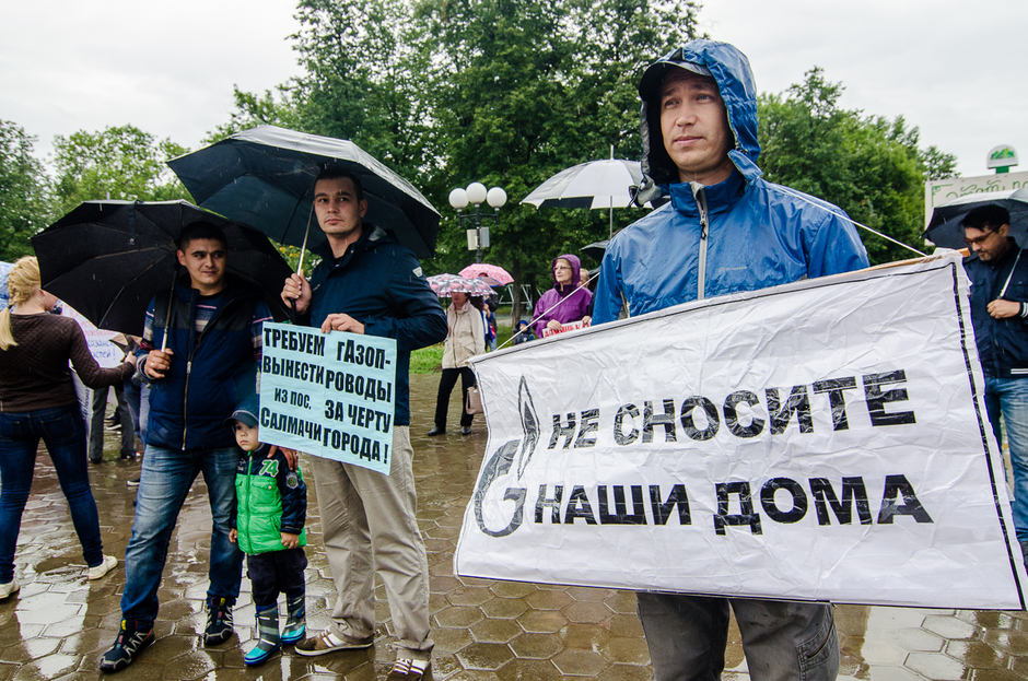 Несмотря на дождь сегодня в парке «Крылья Советов» на митинге собралось около 100 жителей поселка Салмачи. Причина, которая заставила людей в свой выходной выйти с плакатами под дождем, — все те же газопроводы, из-за которых под снос, согласно требованию татарстанского филиала газовой монополии «Газпром Трансгаз Казань», должны пойти несколько домов, под угрозой — еще больше 200. Вся проблема в том, что ряд домов жителей поселка Салмачи находятся в зоне нарушения минимально допустимых расстояний сразу трех магистральных газопроводов. Обращения в различные ведомства, по словам присутствующих, закончились отписками без принятия какого-то конкретного решения.