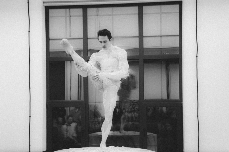 Гипс сохнет, трескается, танцор начинается медленно двигаться, не забывая о безопасности и балетной школе. Круг вертится, гипс скользкий. В конце герой покидает постамент. Именно постамент, хотя в мастерских был бы более уместен стол. Но зато как символично на нем остается «пепел» — остатки гипса.
