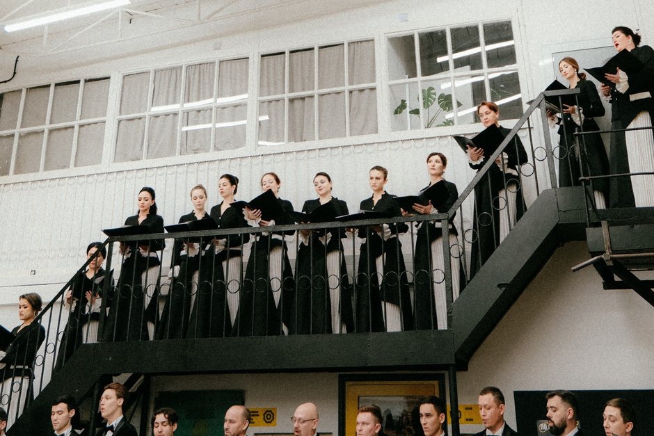 Хор Таминдаровой стоит сбоку, внизу и на лестнице и исполняет семь стихотворений, практически полностью оттягивая на себя внимание. Дополнительного света нет. Миляуша Таминдарова энергично дирижирует по памяти.