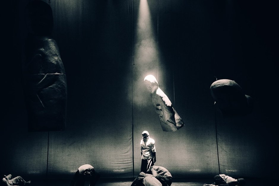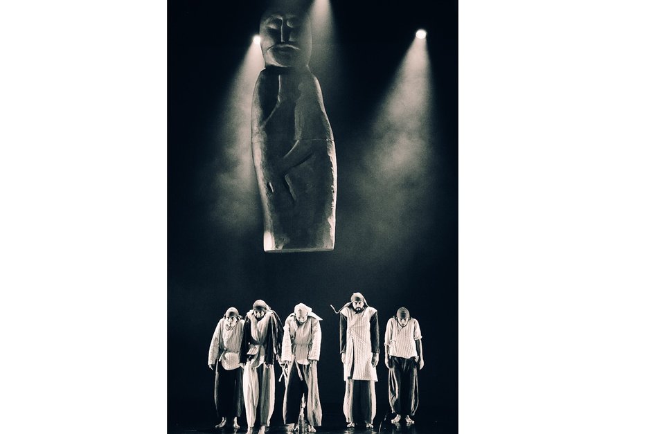 За несколько репетиционных сессий спектакль собрали, а Ислам Валеев, работая с танцорами, написал музыку — с гулкими бочками, кислотным басом и, кажется, сэмплами камней. Танцоры то бесконечно бегут в сторону балбалов, то оказываются под их воздействием, словно они заберут их на небеса, как инопланетяне. А потом герои превращаются в собак, охраняющих территорию. Играют «су-е-фа» и выбирают в жертву. Закономерно, что все кровопролития заканчиваются дискотекой.