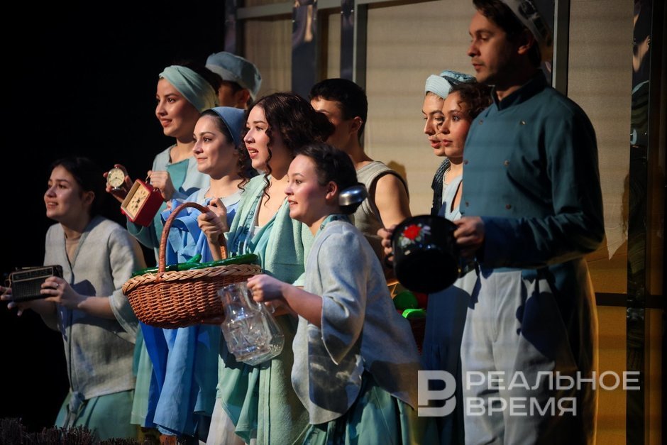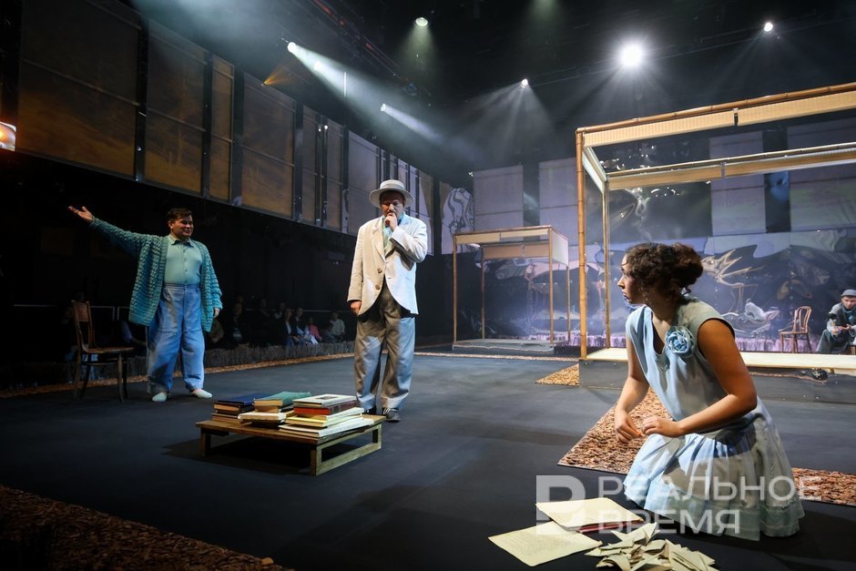Если в оригинале царила атмосфера русской деревни, то у Бикчантаева скорее атмосфера чеховская — благодаря костюмам и общему радужному настрою, царящему в космическом, но в целом вполне провинциальном городишке. Другая ассоциация — добродушные жевуны из книг Волкова. Сергей Скоморохов вытягивает пространство сцены так, что на нее можно смотреть и по длине, и по ширине, выстраивает три павильона, закрывающиеся в стратегические моменты ширмы. Своеобразный оммаж японской архитектуре Камаловского театра. Безвоздушность прочего пространства подчеркивается стеклами, на которых проявляются сцены геноцида и картина «Над городом» Шагала, а также зеркальными поверхностями. И, конечно, постоянно появляющимися у Бикчантаева в постановках искусственными растениями.