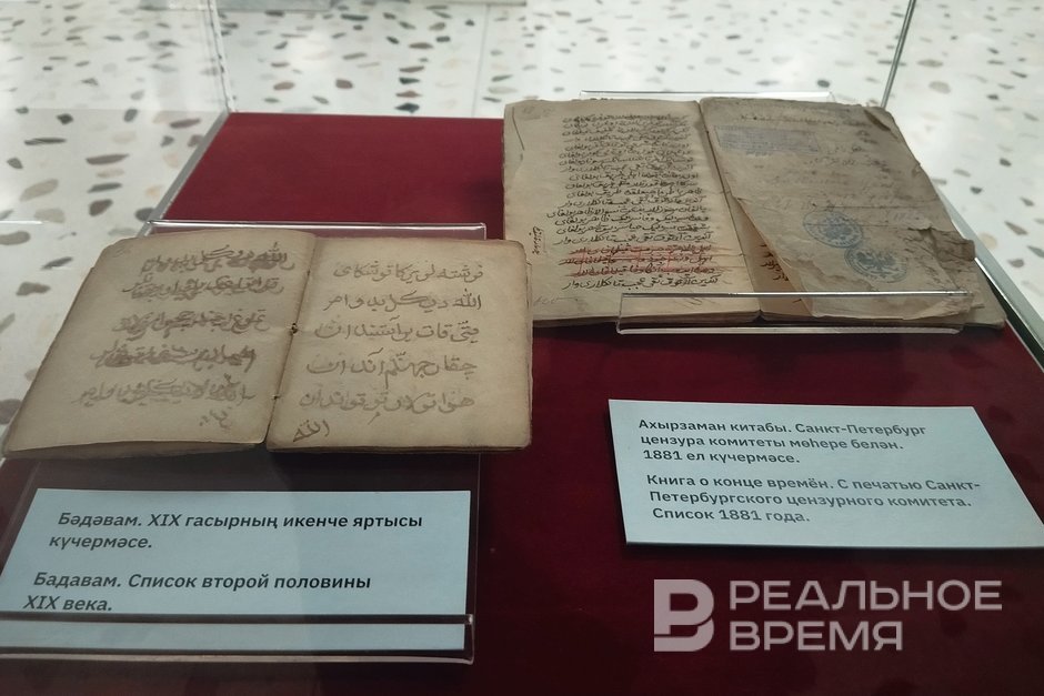 Дополняли небольшую выставку книги из коллекции библиотеки. Среди них — религиозно-дидактический труд «Бәдәвам» второй половины XIX века, «Ахырзаман» о конце света 1881 года (с печатью цензурного комитета). Или, например, собрание стихов по суфийской этике.