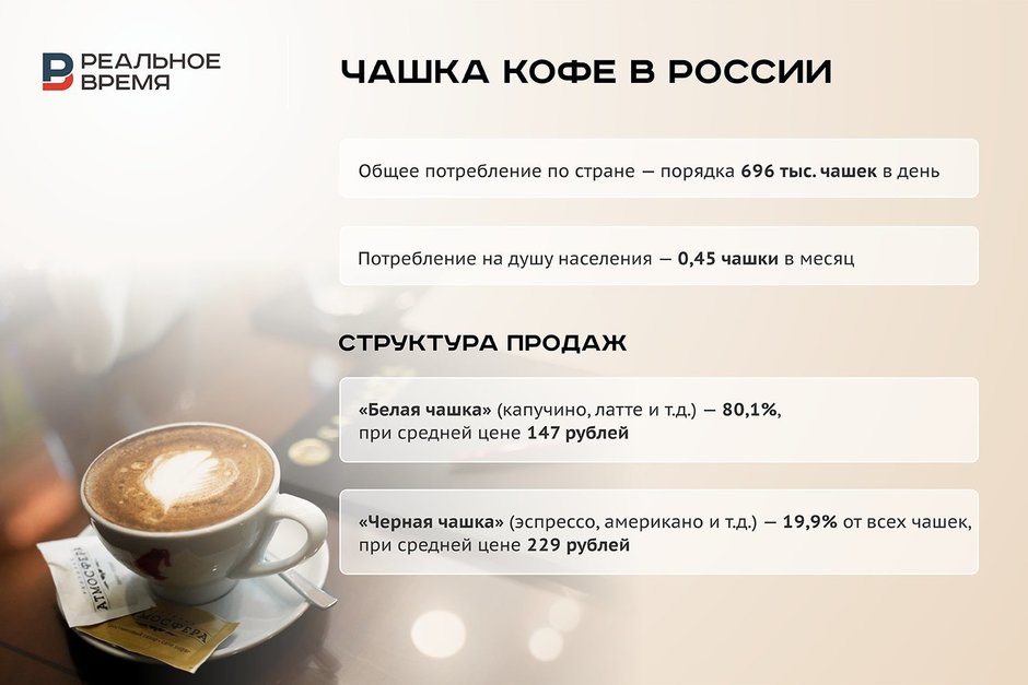 - В структуре продаж преобладает «белая чашка» (капучино, латте и т.д.) — 80,1%, при средней цене 147 рублей, на 13% выше уровня прошлого года..