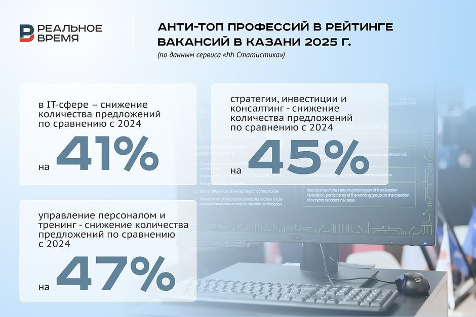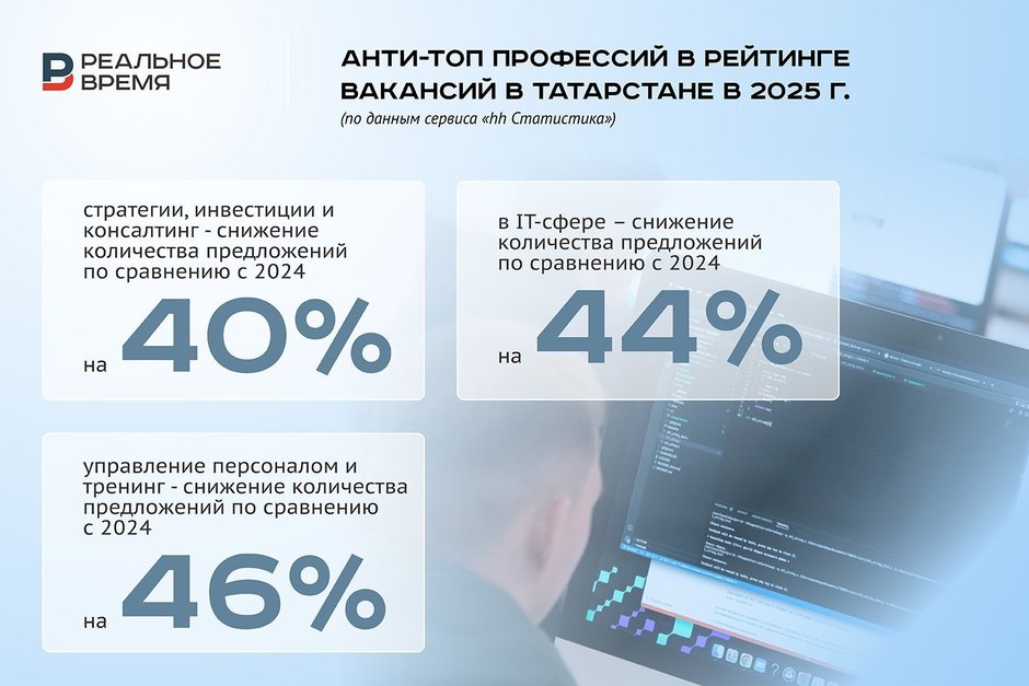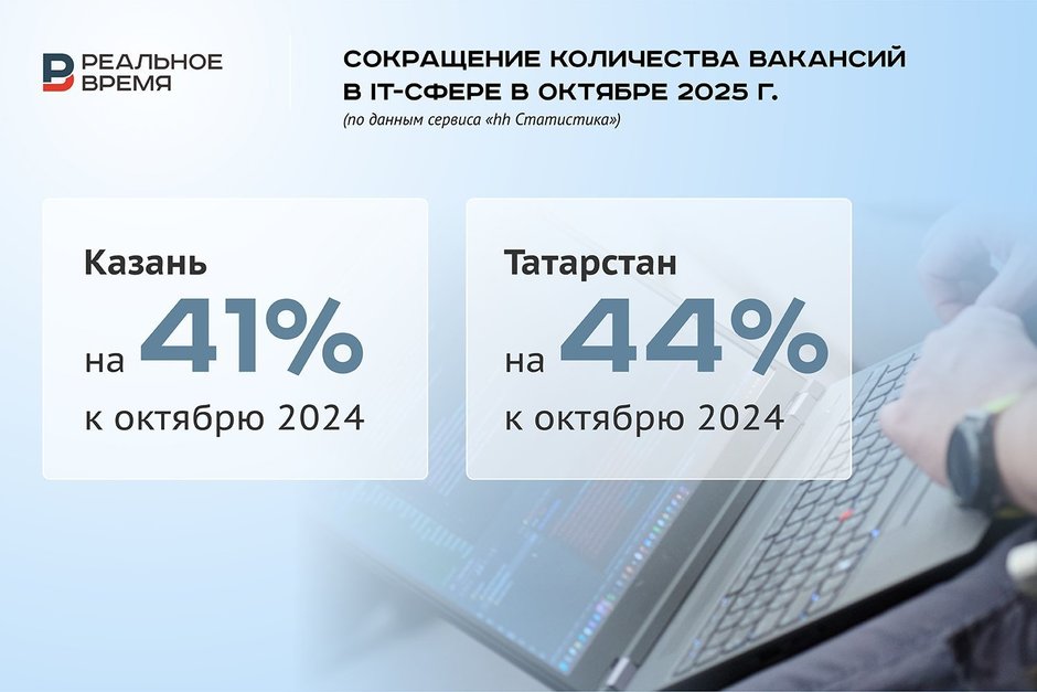 Этой осенью сократить штат сотрудников планируют 12% российских компаний — в 1,5 раза больше, чем год назад, сообщают сервисы «Работа.ру» и «СберПодбор». В октябре зафиксировали абсолютный рекорд падения интереса работодателей к специалистам в области информационных технологий: количество вакансий для них сократилось в Казани на 41%, а в Татарстане на 44% по отношению к октябрю 2024-го, согласно данным на сервисе «hh Статистика».