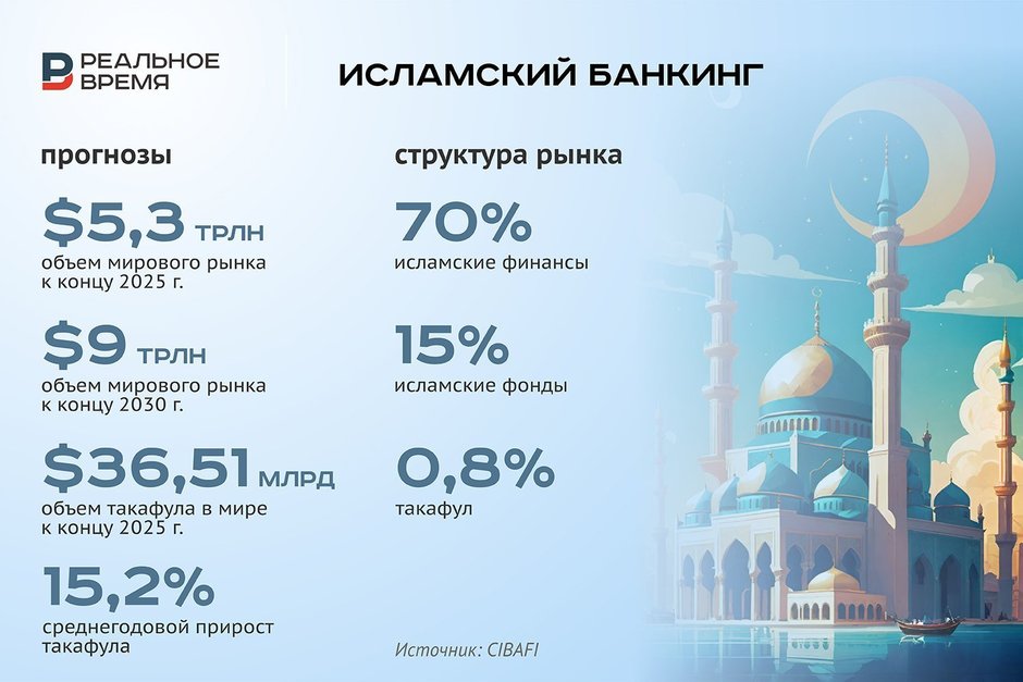 Мировой объем рынка исламского финансирования к концу этого года может достигнуть $5,3 трлн, а через пять лет прогнозируется на уровне $9 трлн, считают в Генеральном совете исламских банков и финансовых институтов (CIBAFI). На сами финансы приходится свыше 70% рынка, около 15% занимают исламские фонды, еще часть — такафул, или исламское страхование. Последний сегмент, по прогнозам, к концу 2025-го превысит $36,51 млрд и в дальнейшем будет расти со среднегодовым темпом в 15,2%.