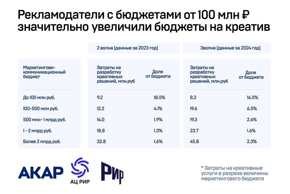 При этом большинство (68%) рекламодателей не раскрывали состав участников закупки. Что интересно, согласно исследованиям, заказчики рекламы с бюджетом от 100 млн рублей в прошлом году значительно увеличили сумму затрат на разработку креативных решений — до 19,6 млн рублей, что составляет 6,5% от их бюджета (годом ранее было 12,2 млн и 4,1% соответственно).
