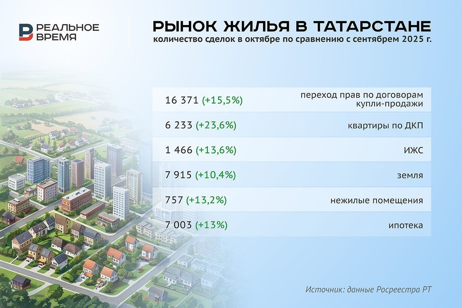 Количество ипотечных сделок, согласно отчету ведомства на портале «Открытый Татарстан», также существенно возросло. В октябре в республике оформили 7 003 жилищных кредита (+13%), из них 2 666 по Казани (+18%).