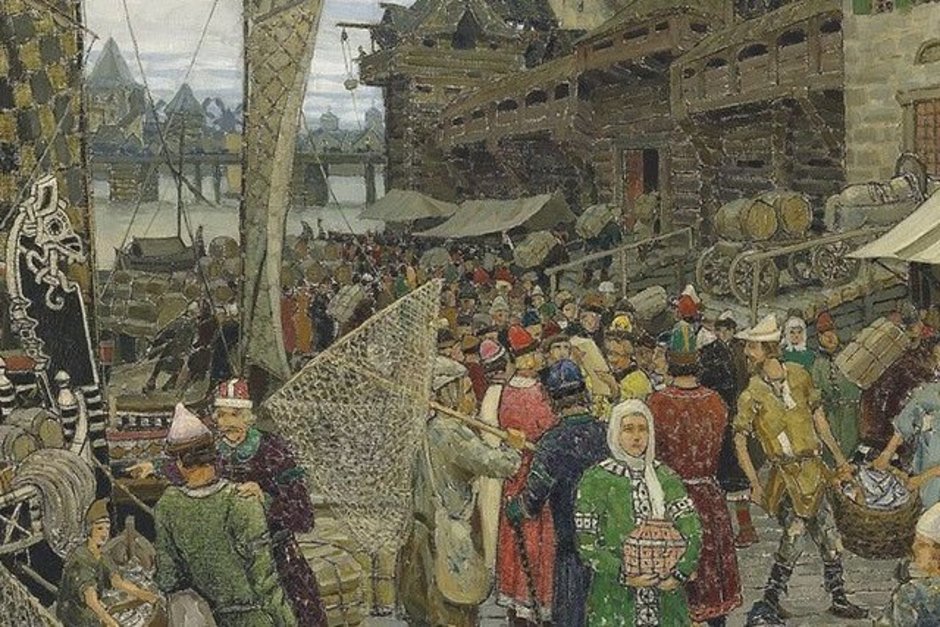 Древний Новгород, славившийся искусными плотниками, был весь застроен бревенчатыми избами (если не считать пары каменных византийских церквей), а его земляные улицы были вымощены деревянными настилами. Город был велик и богател за счет торговли рабами, которых викинги везли с берегов Балтики в Константинополь, и с продажи византийцам экзотических мехов — шкур белого медведя, соболя или тюленя, а также янтаря, китового уса, пчелиного воска и точильных камней. Из Северных стран все эти товары вместе с рабами доставлялись на юг по реке Днепр. Понятно, что улицы города были буквально заставлены купеческими лавками и шатрами. Самым впечатляющим сооружением был новгородский детинец (кремль), расположенный в миле от городских стен. Это был укрепленный дворец, в котором под защитой земляного вала и частокола жили князь и его дружина.