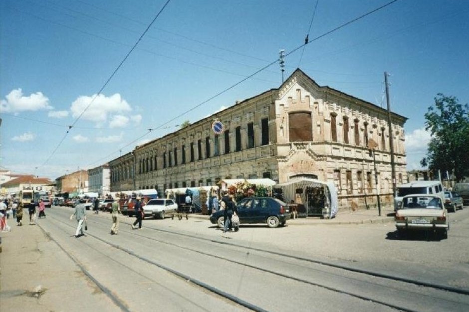Как мы видим, здание законсервировано и ждет своего часа. А тротуары заняты палатками — начинается огромная территория Колхозного рынка и связанной с ней уличной торговли. Машины закрывают единственный проезд, так что пробраться отсюда к вокзалу проблематично. Сейчас на здании висит табличка: «в сентябре 1833 года проездом в город Оренбург остановился великий русский народный поэт А.С. Пушкин». Это, конечно, неправда, солнце русской поэзии бывало в гостях у Карла Фукса, чей дом стоит на Галиаскара Камала, но на углу с Московской. Ошибку исправить не могут до сих пор.