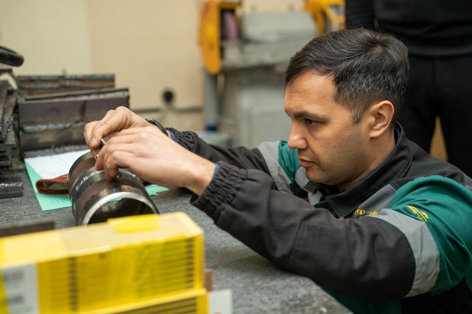 — Мы изготовили пластину по чертежу. Далее будем измерять вал, дефектовать и перепаковывать арматуру перед установкой сальников. Сложностей не возникло. В этой профессии с 2008 года, а в «ТАИФ-НК» работаю с 2019-го. За эти годы многому научился, — рассказал слесарь по ремонту технологических установок цеха №08 КГПТО Семен Казаев.