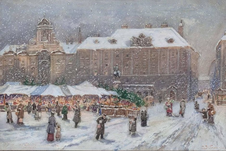 Рынок во Внутреннем городе Вены, Ам-Хоф зимой. Эммерих Киралл, 1925 год. Иллюстрация из книги Бернда Бруннера «Жажда зимы»