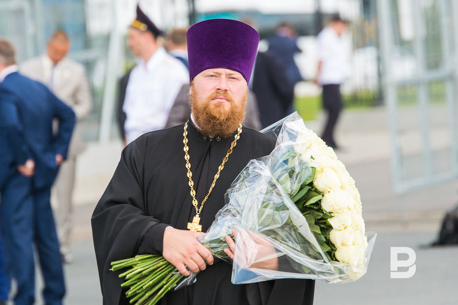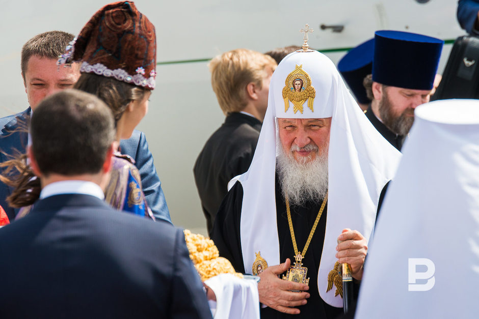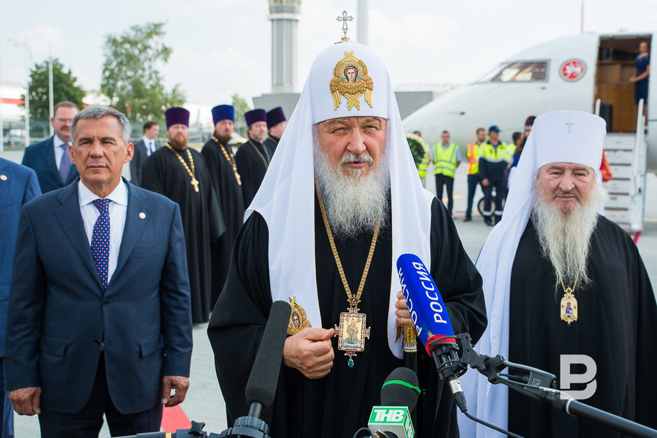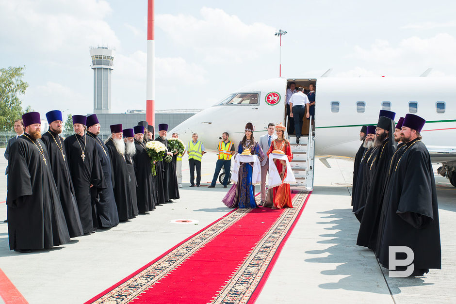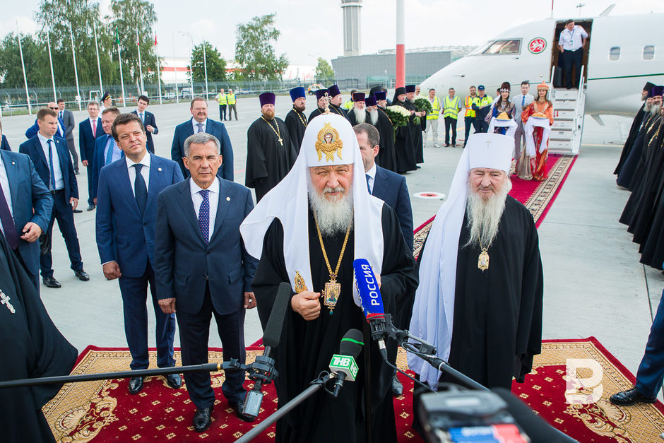 За час до прилета на поле расстелили ковровую дорожку, ковер, прошлись кинологи с собаками, заняли отведенное им место журналисты. Священники выстроились двумя шеренгами параллельно ковровой дорожке. Самолет с Патриархом приземлился точно в назначенный час, у трапа его ждали огромные букеты белых роз и традиционный чак-чак. Глава РПЦ поздоровался с Рустамом Миннихановым и Михаилом Бабичем, с митрополитом Феофаном, священнослужители пропели «Многая лета», и высокий гость подошел к журналистам.
