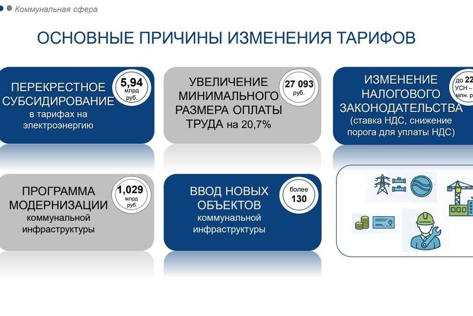— Основную долю в регулируемых отраслях занимает коммунальный комплекс с оборотом 185 миллиардов рублей, при этом на услуги населению приходится порядка 104 миллиардов, — подчеркнул он. — Во всех регионах страны в соответствии с федеральным законодательством в 2026 году предусмотрены два этапа плановой индексации тарифов на коммунальные услуги.